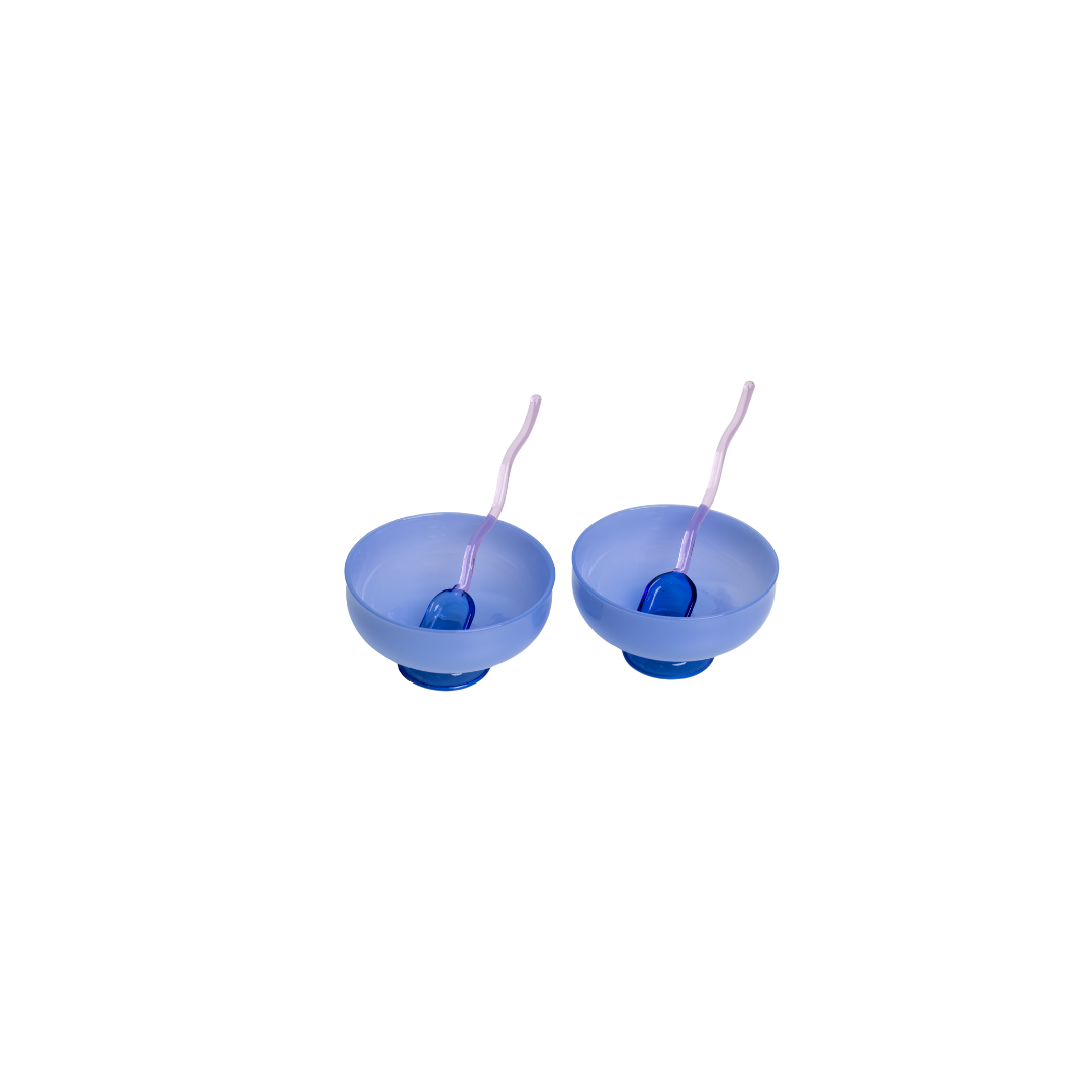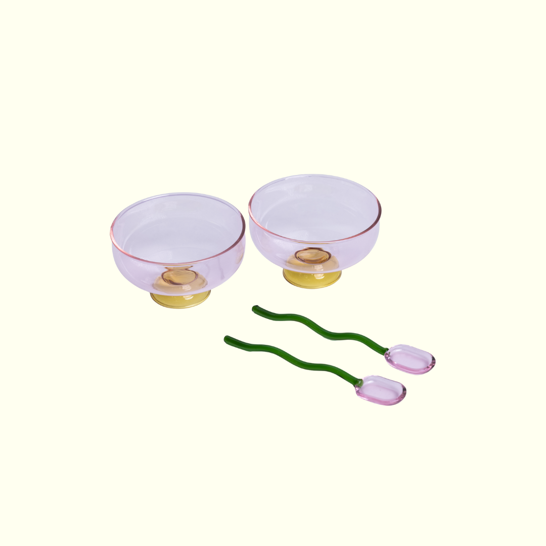 Torch-spun from borosilicate glass, these radiant spheres are made to serve and shine. Perfect for ice cream, salty bites, or anything snackable. Each set includes two bowls and two matching spoons—because presentation is part of the pleasure.